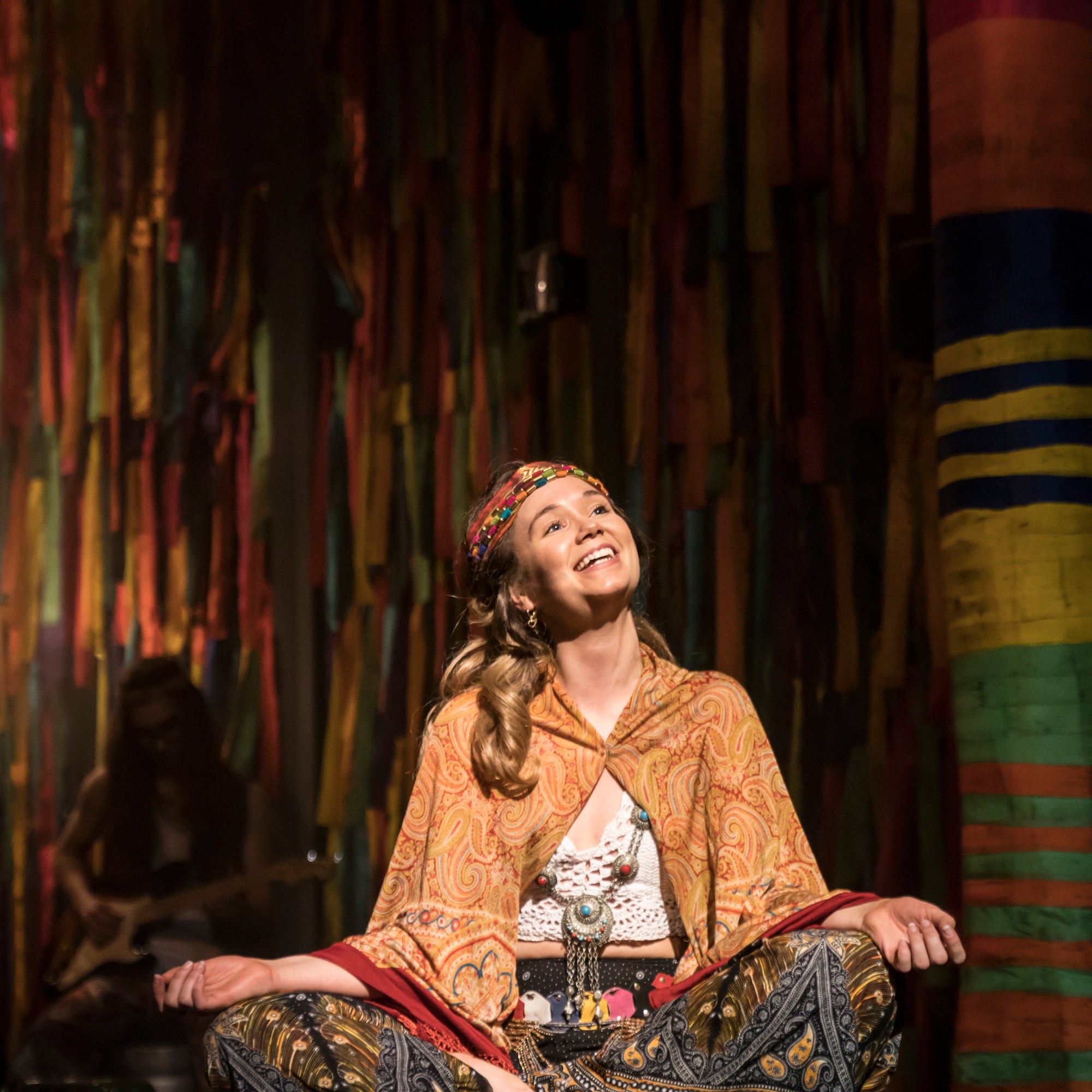 Maeve Black’s costume and stage design is simple and effective; the stage is framed by a large chain linked fence decorated with various coloured ribbons as are two large trees. Tree stumps surrounded by flowers and grass running along the front edge of the stage draw the viewer into the hippie commune world of “the Tribe”.